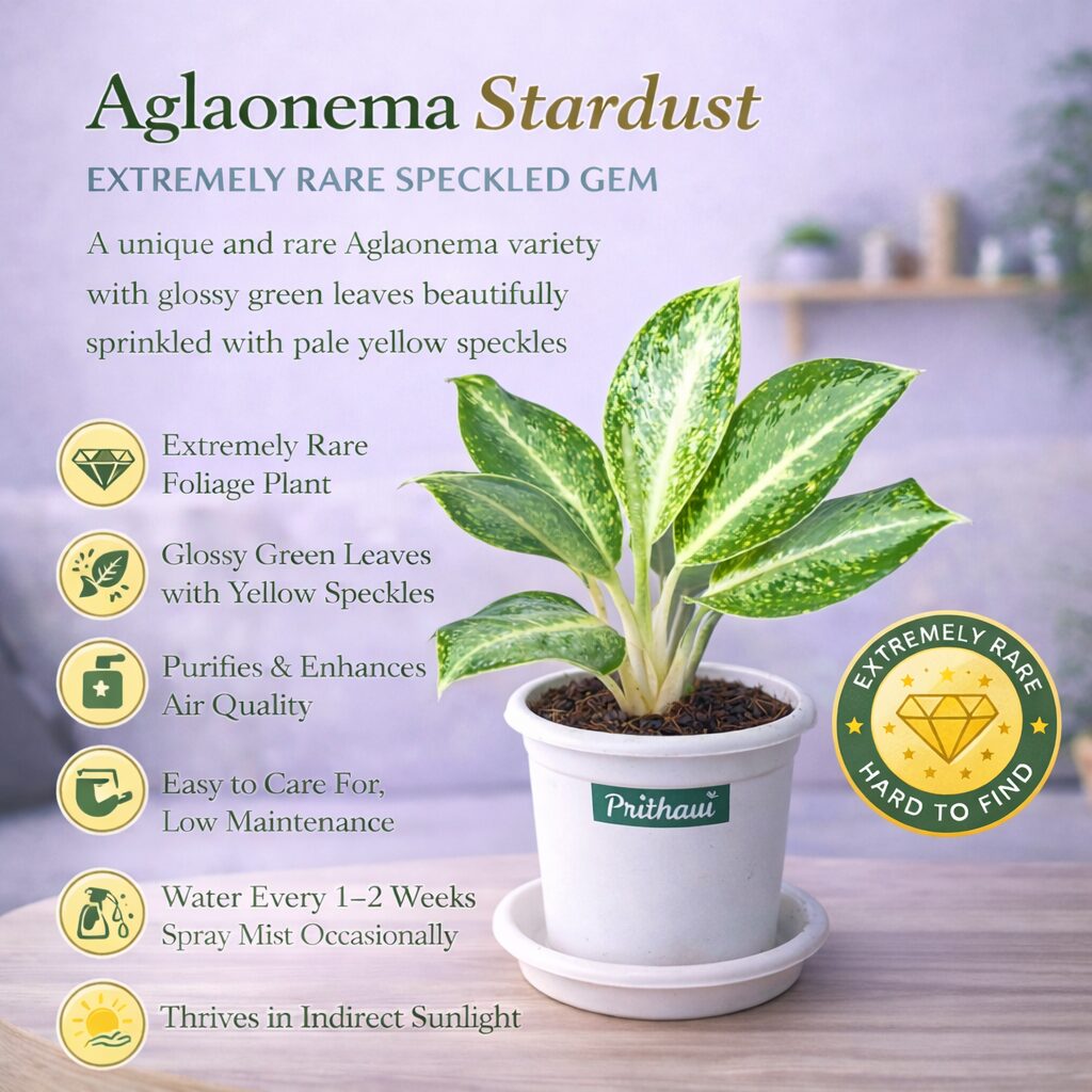 Add a touch of elegance with the Aglaonema Star Dust, a rare and eye-catching indoor plant featuring glossy green leaves dusted with golden-yellow speckles. Known for its air purifying qualities, this plant is perfect for improving indoor air and uplifting your space. It thrives in low to medium light, needs minimal watering, and is ideal for desks, corners, and tabletops in your home or office. A stylish, low-maintenance choice for modern interiors.