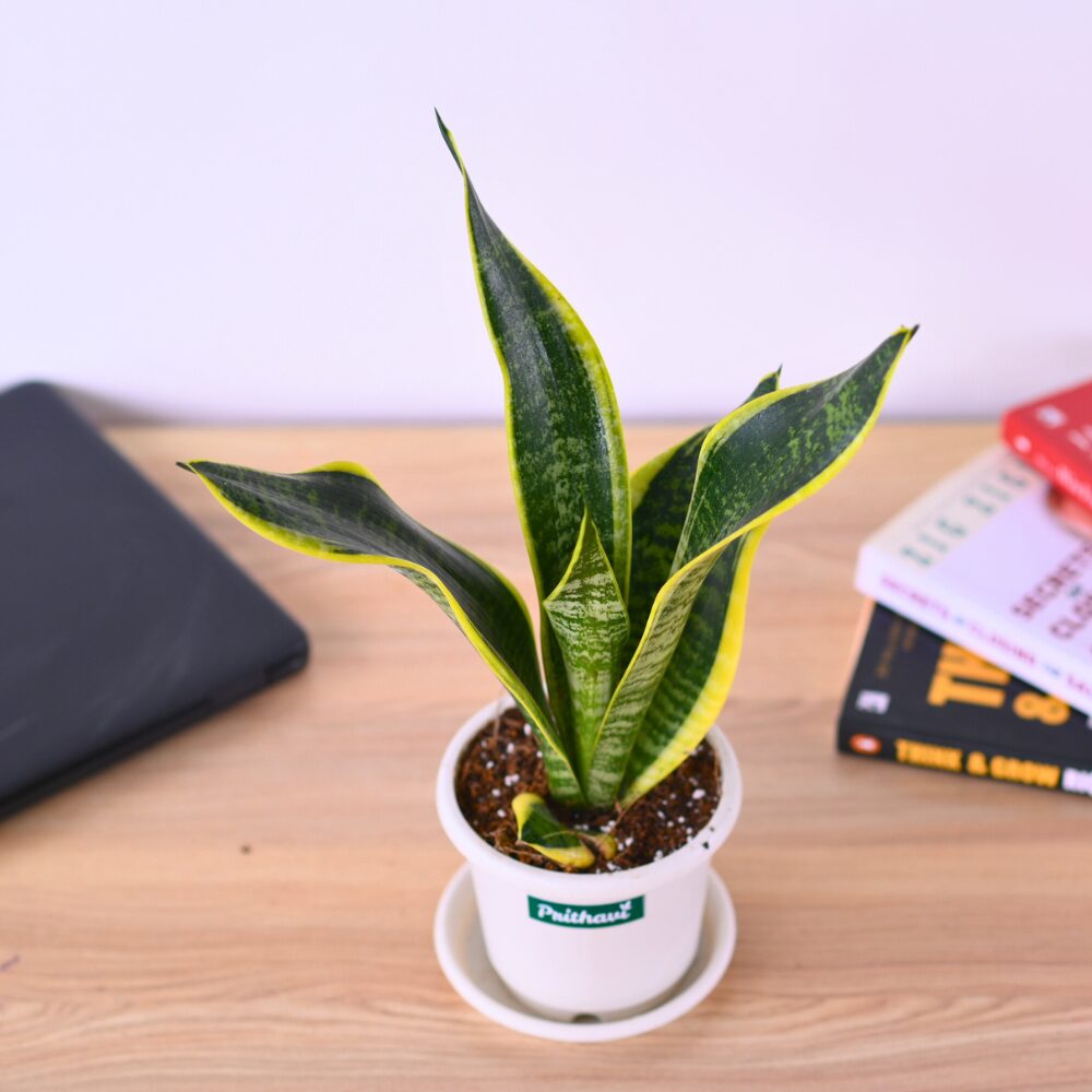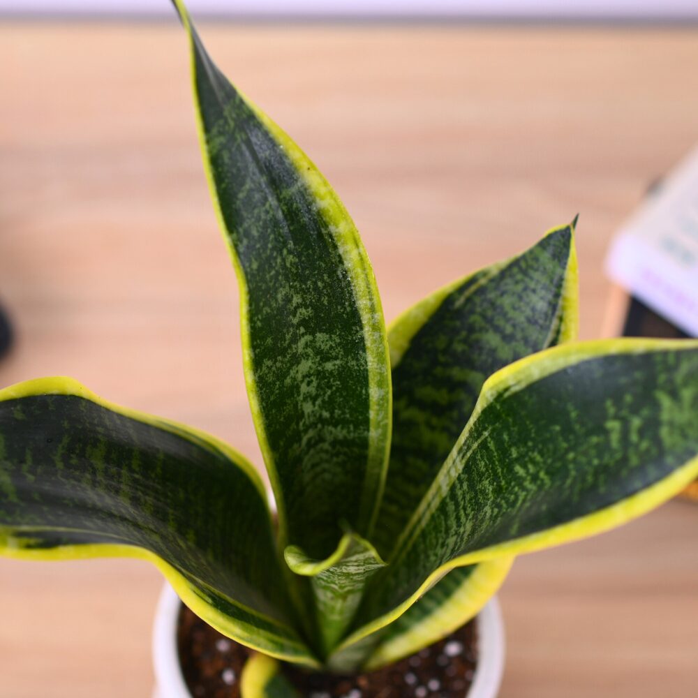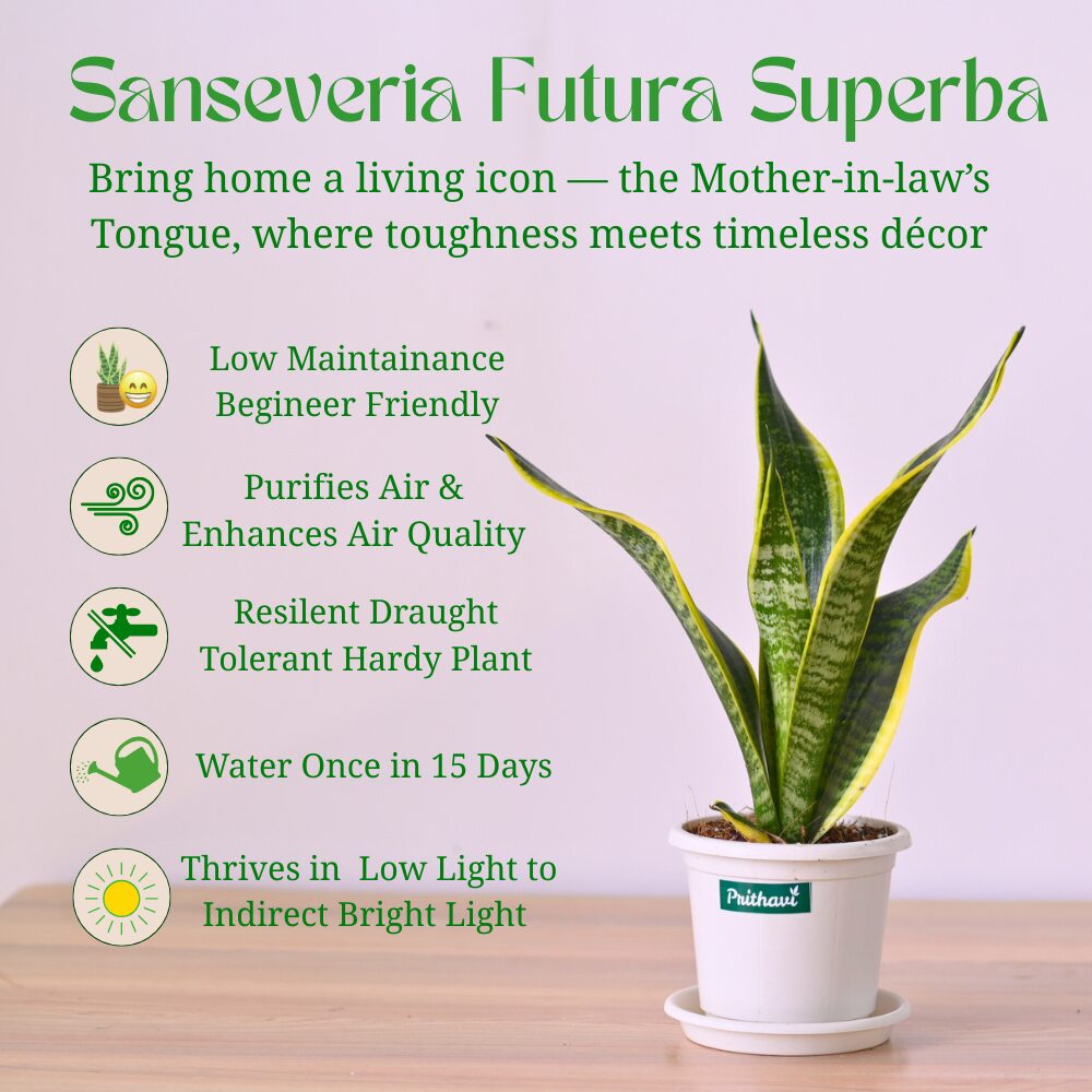 The Sansevieria Futura Superba is a striking succulent with upright sword-like leaves edged in bold golden-yellow.